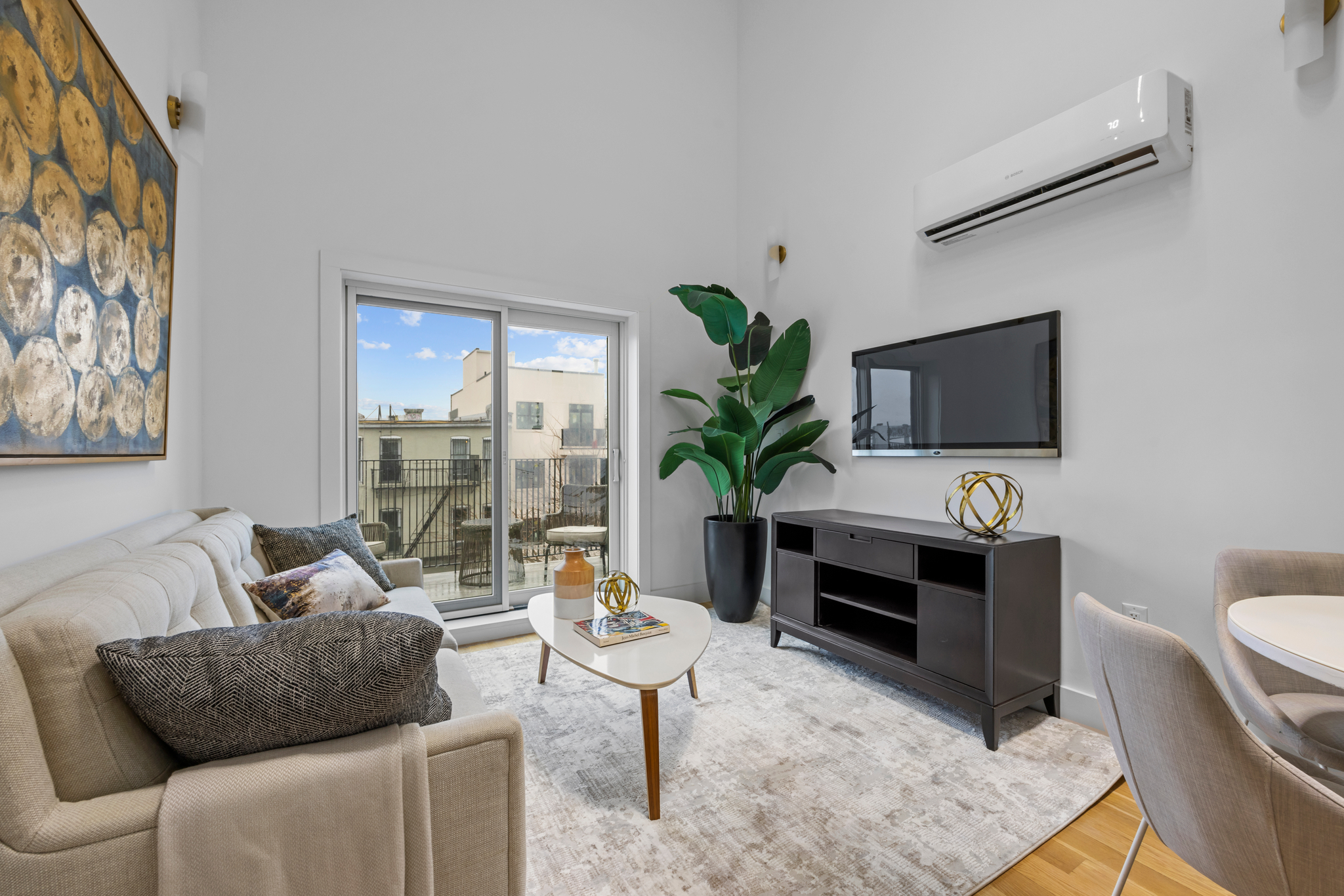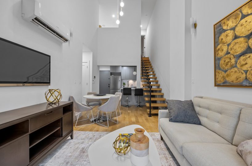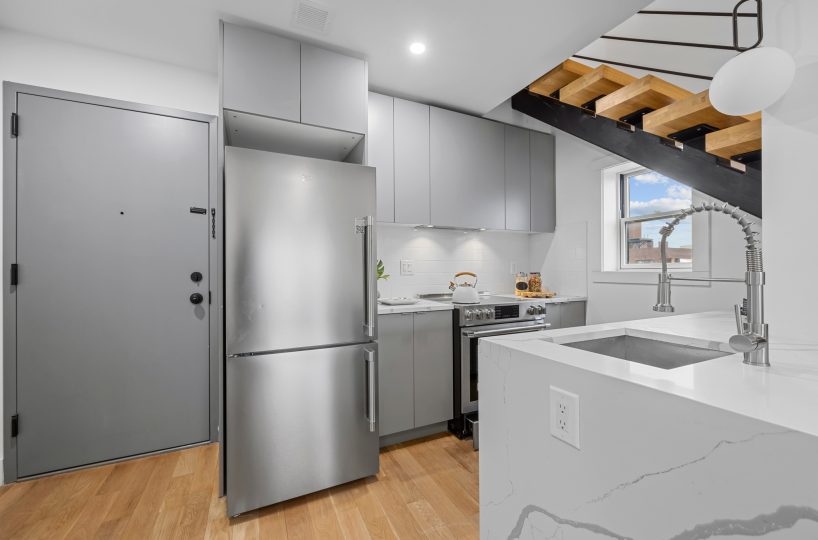 The Parlor floor features an expansive sun drenched, modern open concept living/dining area. The elegant chefs kitchen is equipped with floor to ceiling custom cabinetry, adorned with a full fleet of stainless steel appliances & island for bar stool seating. Spacious bedroom & full bath with spa like finishes. Up a flight of designer floating stairs the elegant primary suite awaits you which leads out onto a private 280 sq/ft outdoor deck.