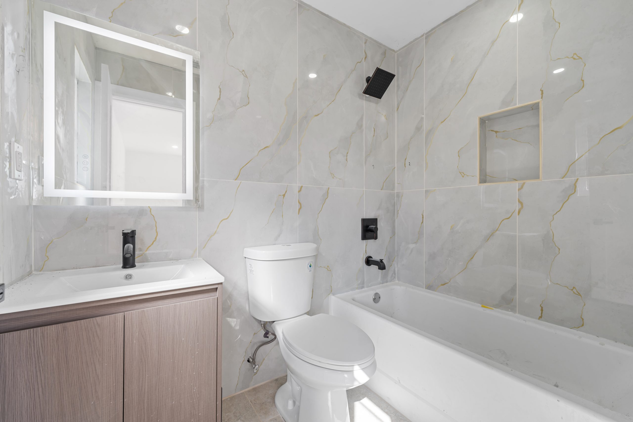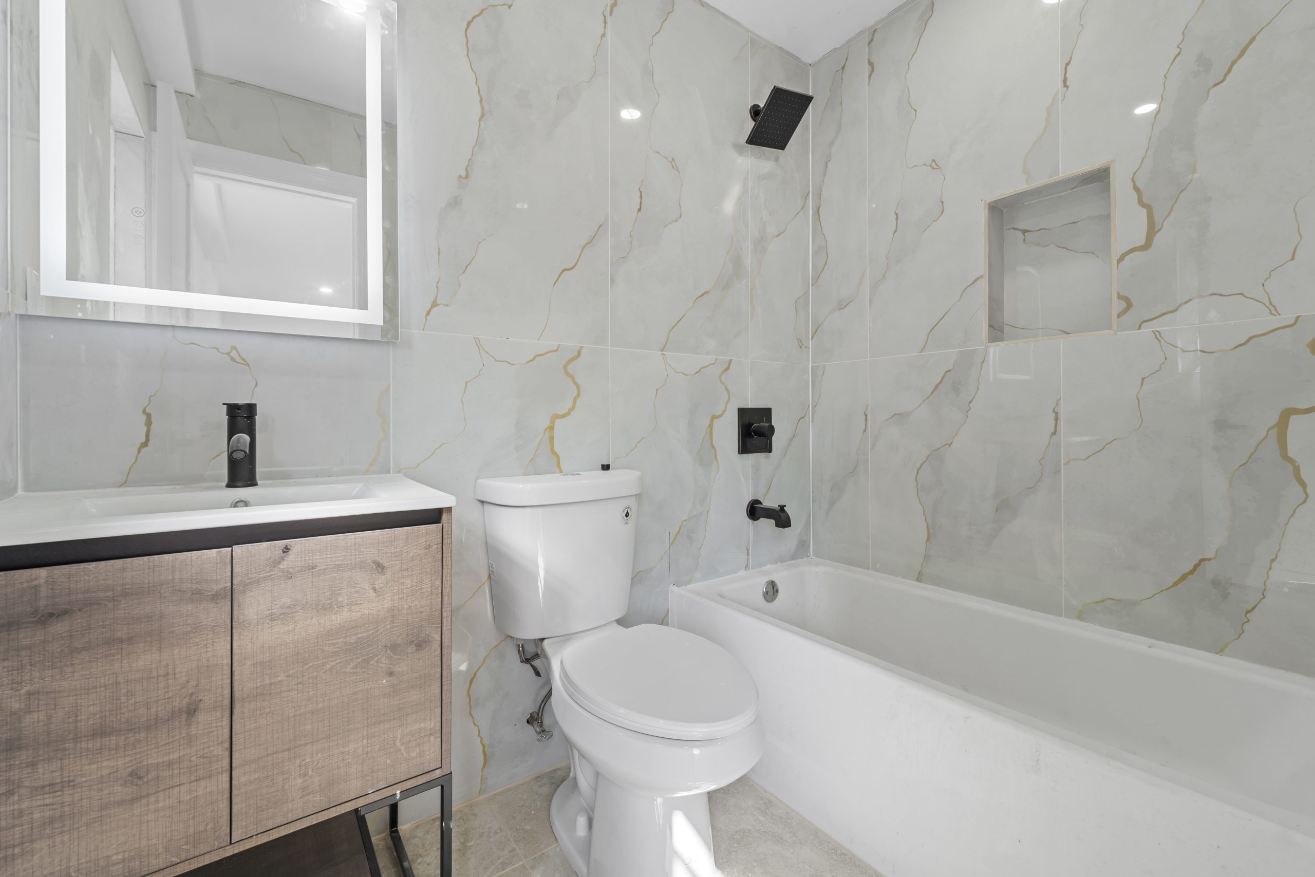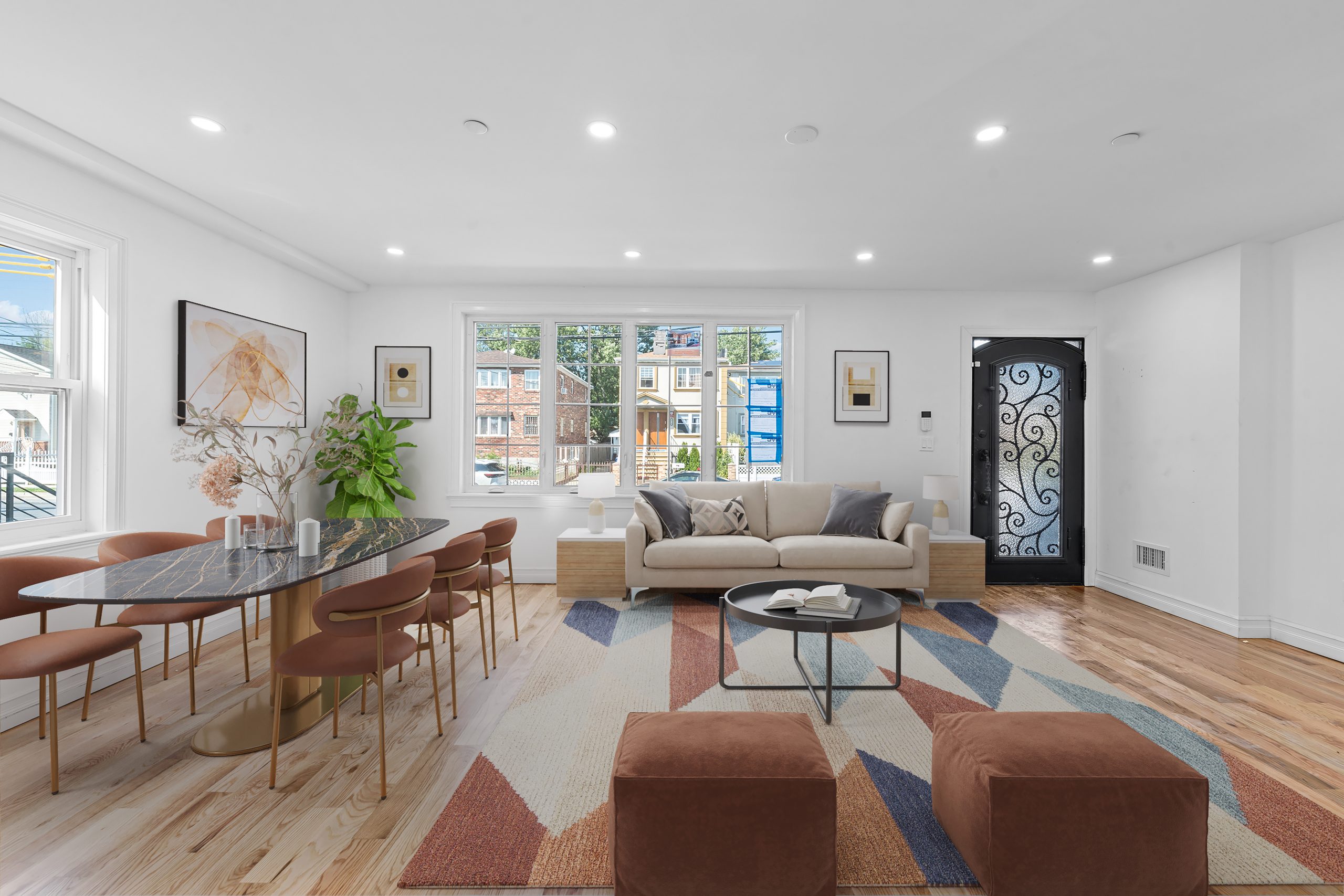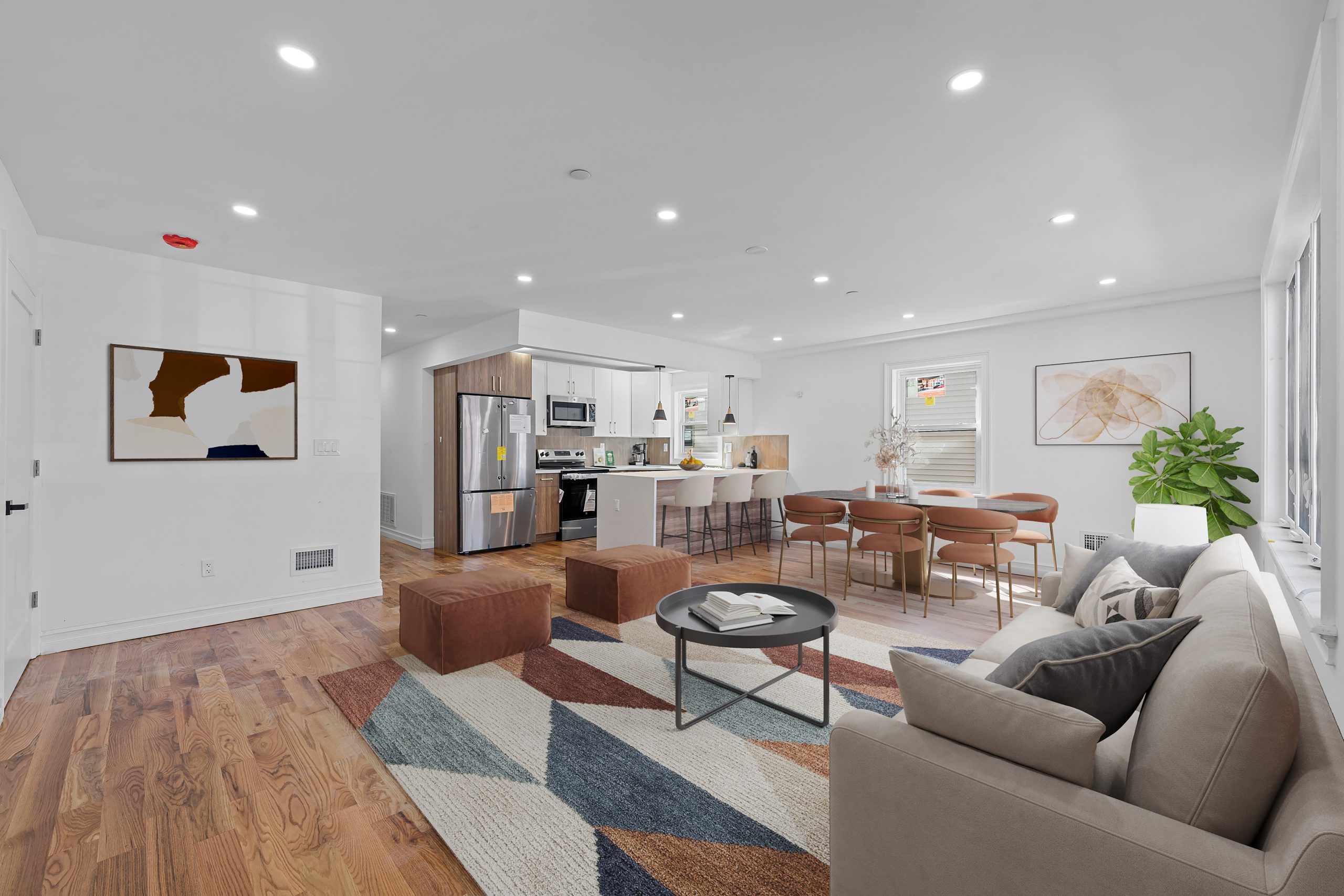 Construction includes brand new select wide oak wood flooring, recessed lighting, Central HVAC, electrical, heating and plumbing systems.