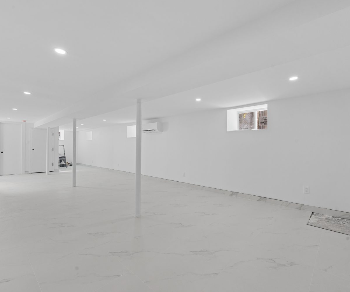 The high ceiling finished basement has exterior access and can easily be used as the perfect guest quarters, in-law suite, or additional recreational space.
